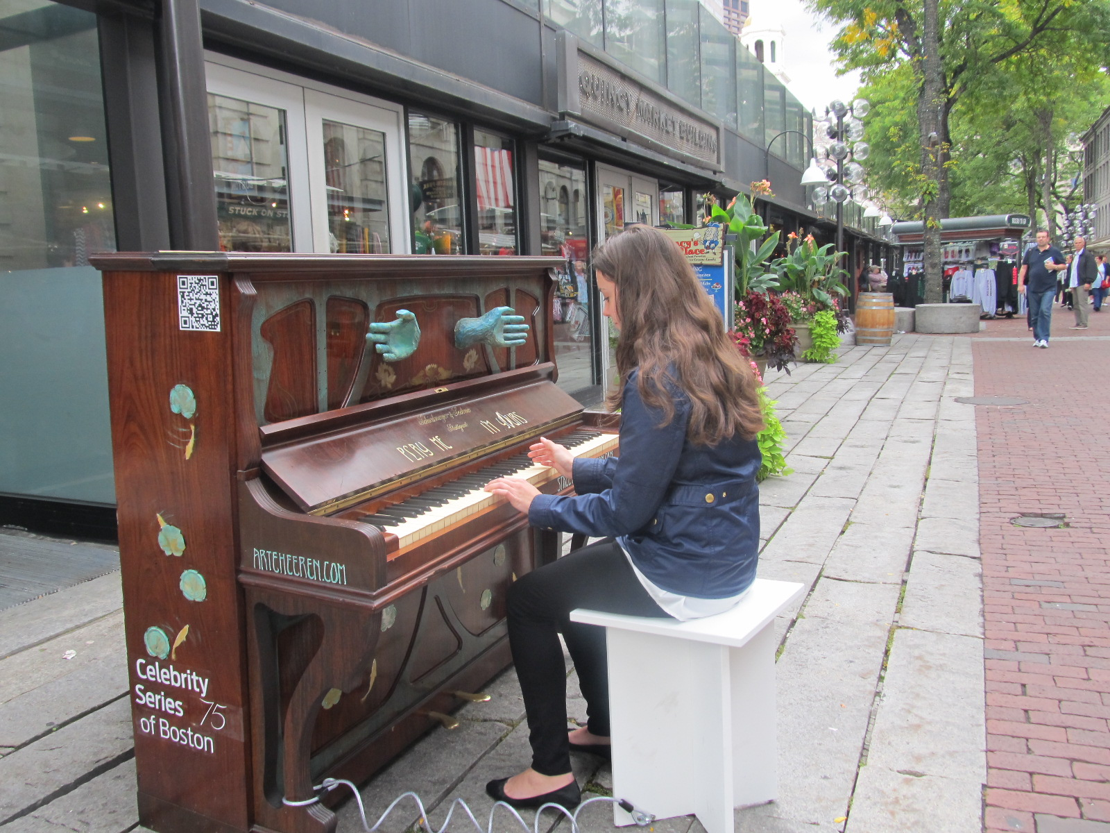Faneuil Hall’s piano is distinct with blue musical hands above the keyboard, decorated by Gina Heeran and donated by Louis Gentile. The piano will be located in the North Market Area of Faneuil Hall Marketplace easily accessible for all would be and trained pianists. This temporary installation will add to the already lively area that features daily free performances by musicians, jugglers, acrobats and others.