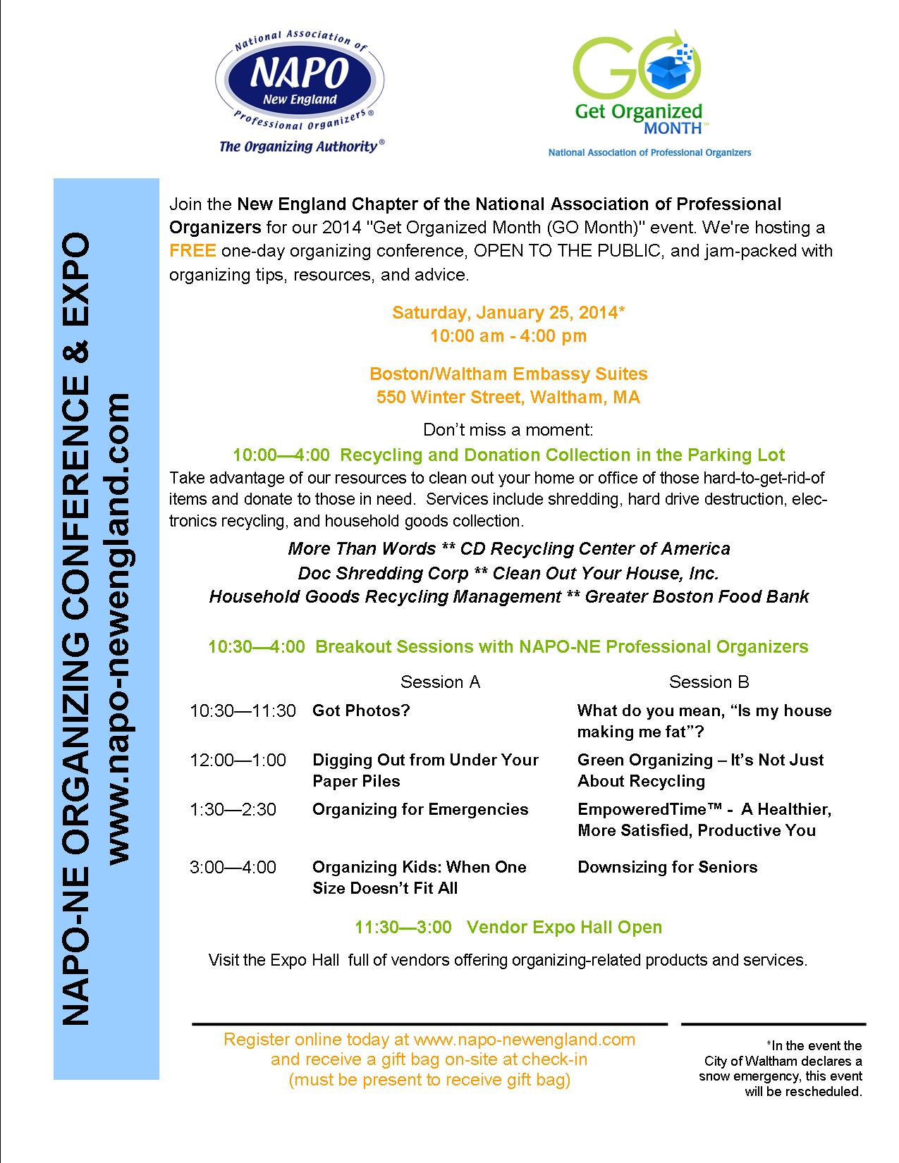 Join the New England Chapter of the National Association of Professional Organizers for our 2014 "Get Organized Month (GO Month)" event. We're hosting a FREE one-day organizing conference, OPEN TO THE PUBLIC, and jam-packed with organizing tips, resources, and advice.