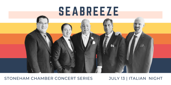 The Stoneham Concert Series welcomes Seabreeze for our annual Italian Night celebration! Join us on the Town Common on Thursday, July 13 at 7:00 p.m. for Italian standards sung by Stephen Savio and joined by his talented band. Also on hand will be StonehamBank with giveaways, complimentary ice cream from Astound by RCN.