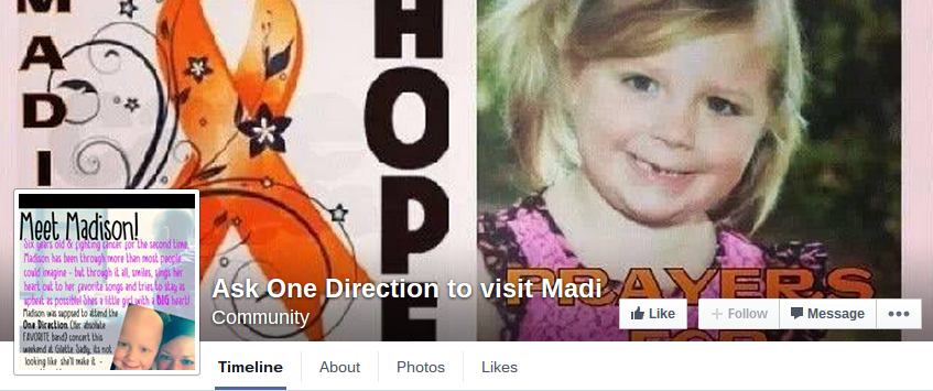 The page, dubbed “Ask One Direction to Visit Madi,” was set up to gain support and requests for the band to visit Bergstrom at the hospital. As of Friday, the family had not heard from the band, according to a recent post.