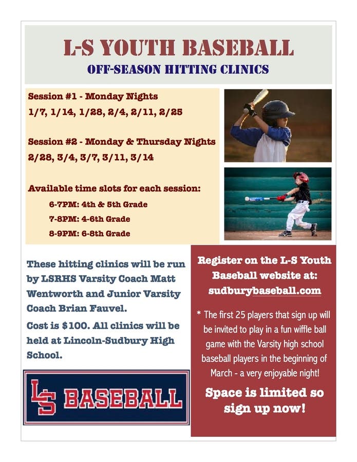 LS Youth Baseball is offering hitting clinics run by LSRHS Varsity Coach Matt Wentworth and JV Coach Brian Fauvel with support from the high school baseball players. The cost is $100 for each session and all clinics will be held at Lincoln-Sudbury High School. Registration is through the LS Youth Baseball website at www.sudburybaseball.com.