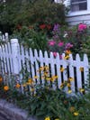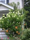 She’s only exaggerating slightly. Barely contained by a white picket fence, Dart’s front yard is a feast for the eyes: roses, phlox, crocosmia, orange cosmos, lilies, daisies, heliotropes, cone flowers, among others grow up over 4 feet. A snowball hydrangea threatens to engulf the front door.