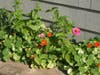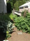 A vegetable garden along the side of the house contains tomatoes, cauliflower, eggplant and zucchini.