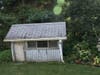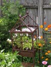 A whimsical mini-metal greenhouse Hughes found in the trash serves as a planter for some impatiens.