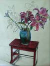 The pictures capture a natural air, how the flowers fall, how they are arranged, yet with a fresh perspective. One drawing wraps a corner. In another the flowers to one side are in black and white; Webber had left to attend to something else and when she resumed the drawing the flowers had died. So, although she never formally finished the picture it works the way it is, unfinished.