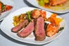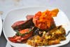 1.Spicy Grilled Flank steak, basil- butter poached lobster, sauteed Rainbow chard, acorn squash-corn hash, baby heirloom tomato melange.