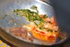2. Pan seared salt & pepper salmon, butternut-zucchini pancake, red and purple pepper puree, edible flowers.