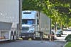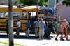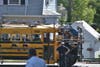 School buses labeled Stanton, (CT) — a fictional town that serves as the setting for Grown Ups 2 — rolled. One bus had staging and lights attached to the front.
