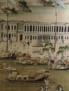 The paper is a vibrant snapshot of Canton in the 1780’s. In every corner is someone going about their day. A river packed with small boats—sampans, and a larger junk to the right—runs along the bottom. Then come the “hongs,” each flying the flag of the foreign country—Denmark, Spain, France, Sweden, England, Netherlands. In one panel two men in western dress chat.