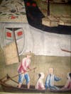 Above the “hongs” is the Chinese section of city. Everyone is in Chinese dress. Interspersed between the smaller buildings and green trees are jugglers, a tightrope walker, people shopping at carts and a man working in a field. And as is typical in Chinese art, the more worldly images at the bottom are crowned by what is considered the more spiritual images--mountains. The wallpaper doesn’t have western perspective--the people at the top of the paper are the same size as the people at the bottom.