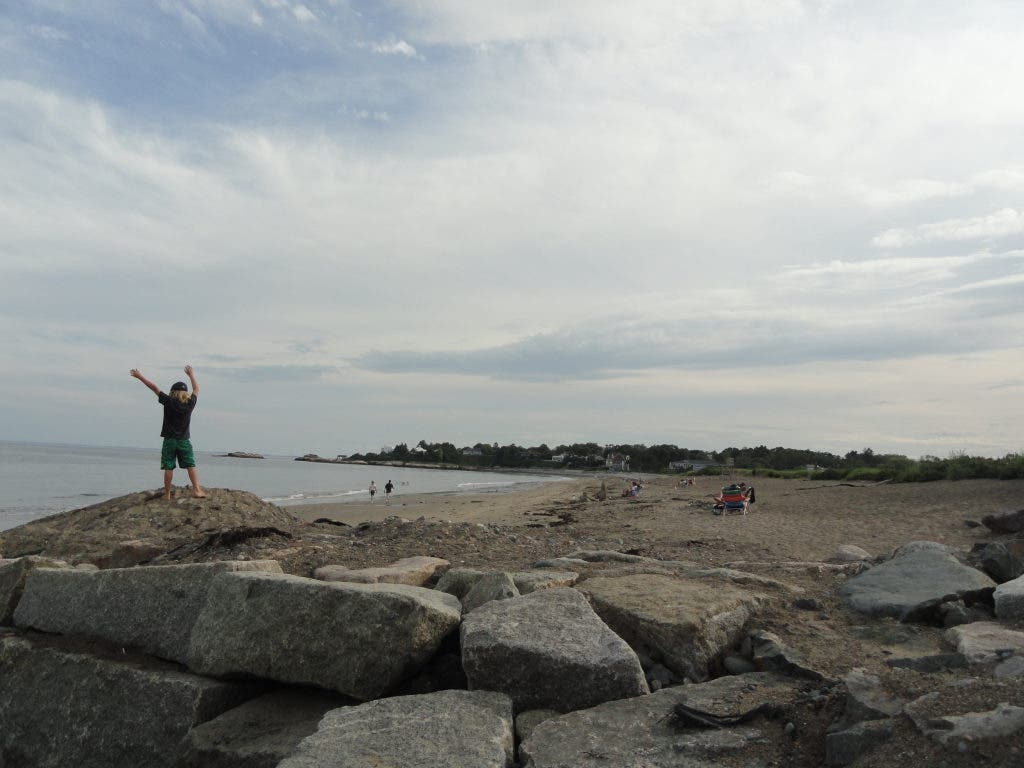 A boy plays on the rocks at Phillips Beach.Â