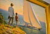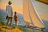 The Dreamers pictures a father and son at the shore. The boy holds a toy sailboat as they watch a a large sailing vessel pass below, its light-filled sails angled toward them.