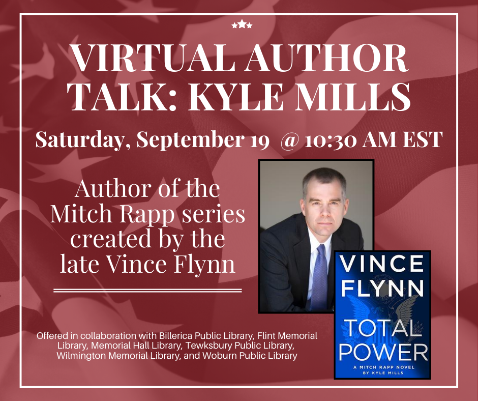TEWKSBURY, MA – Six Massachusetts libraries have joined forces to host bestselling author Kyle Mills for a Zoom webinar on Saturday, September 19, 2020 at 10:30am.