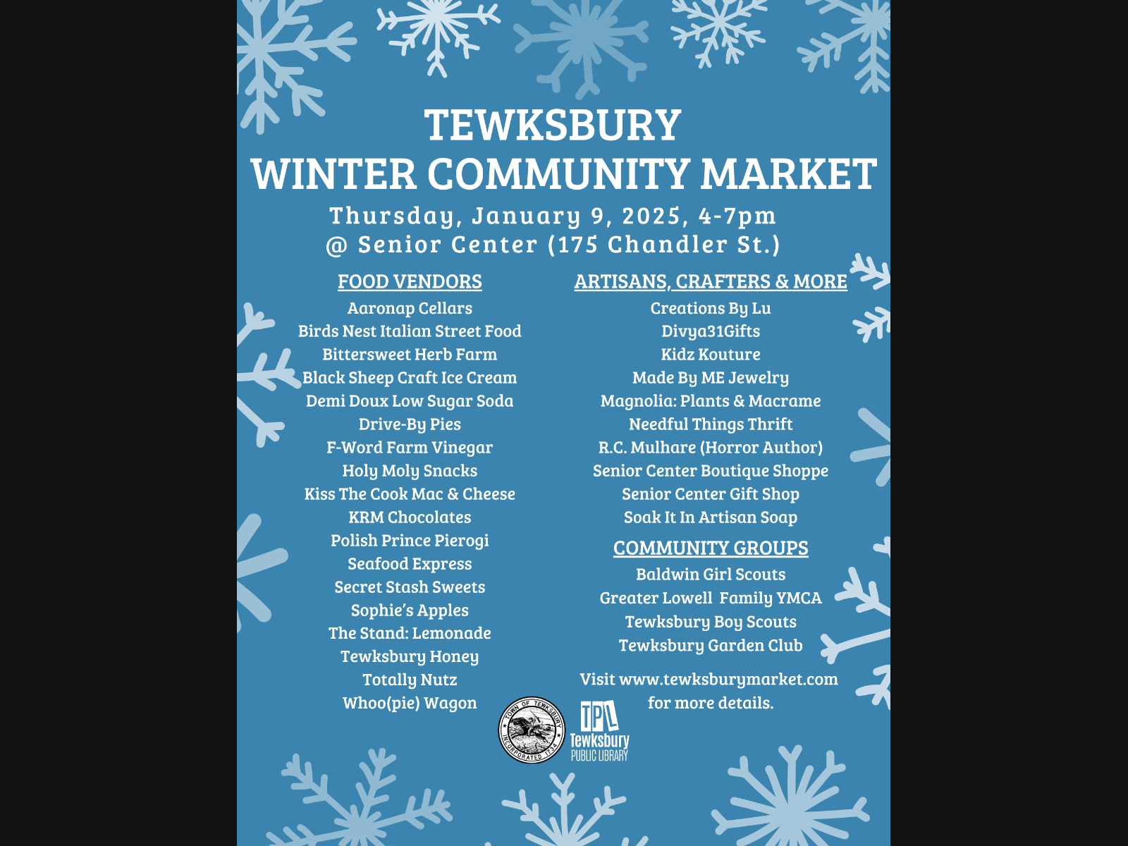 TEWKSBURY, MA – The Tewksbury Community Market is holding four special winter markets on the seconds Thursdays of the month in November (Nov. 14), December (Dec. 12), January (Jan. 9) and February (Feb. 13), from 4pm to 7pm, inside the large hall at the Tewksbury Senior Center (175 Chandler Street).
