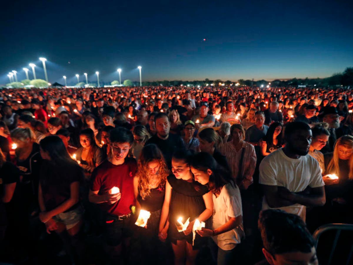 TOP: People attend a candlelight vigil for the victims of the February 14 shooting at Marjory Stoneman Douglas High School, in Parkland, Fla., Thursday, Feb. 15, 2018. Nikolas Cruz, a former student, was charged with 17 counts of premeditated murder. (AP Photo/Gerald Herbert)