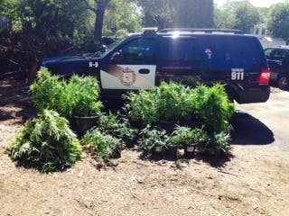 Detectives found 23 large marijuana plants and equipment in the woods behind 1080 Main St.