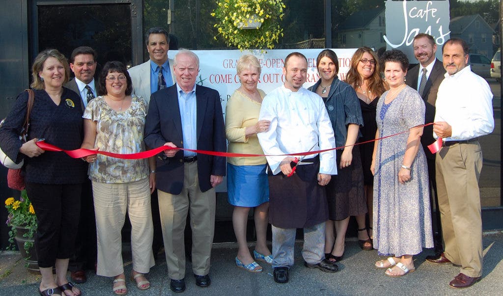 Café Jag’s recently held a ribbon cutting ceremony with the Wakefield Chamber of Commerce and Town Officials to celebrate the re-opening of the Tuttle Street restaurant. On hand for the festivities were (from left to right) Chamber Executive Director Kendall Inglese, Chamber Directors Dave D’Onofrio and Nancy Rollins, Wakefield Town Administrator Steve Maio, Chamber Director and Selectman Al Turco, Wakefield Selectman Betsy Sheeran, Café Jag’s owners Jay and Adriana Guzzo, Chamber co-Presidents Tania Alongi and Suzanne Bowering, Chamber Director Larry Andrews, and Chamber Director and Selectman Paul DiNocco.