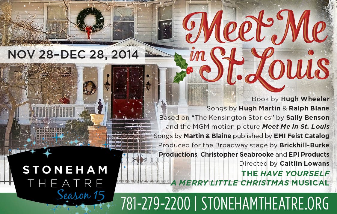 Meet Me in St. Louis opens on November 28, 2014 and runs through December 28, 2014. Performances are Thursdays at 7:30pm, Fridays at 8pm, Saturdays at 2pm and 7pm, and Sundays at 2pm. The Press Opening is Saturday, November 29, 2014 at 7pm. There is a post-show talkback on Sunday, November 30, 2014. Tickets are $50–$55. Senior tickets are $45–$50. Student tickets are $15 (with a valid ID). For more information or to purchase tickets, call Stoneham Theatre’s Box Office at 781-279-2200, or visit www.stonehamtheatre.org.