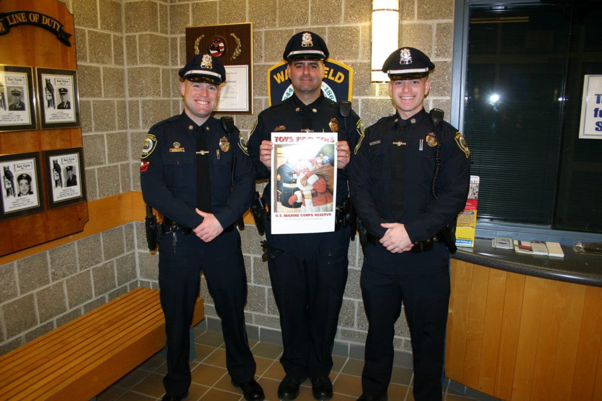 | Marine Corps veterans Sgt. Jon Burnham, Detective Kenneth Silva and Officer John Whaley have volunteered their time to aid in this important mission to help families in need during the holiday season on behalf of Wakefield Police. |