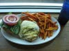 The sandwich was quite substantial and tasted fresh, with a large medallion of grilled chicken and just the right amount of pesto. The romaine lettuce was crunchy and the red onion not too hot. Simple yet satisfying. We chose the side of sweet potato fries, which were creamy and tasted like real potatoes.