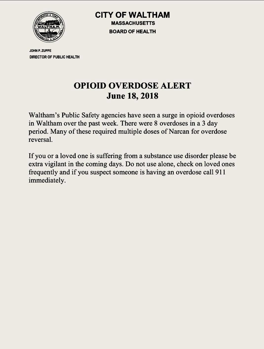 WALTHAM, MA — In the past three days there were eight reported overdoses in Waltham, according to police and the Waltham Director of Public Health. A number of those overdoses needed multiple doses of Narcan, the opiate reversal drug to revive those who were overdosing. Thankfully, none of those were fatal say public health officials.