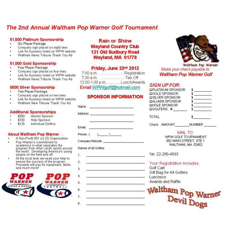 Waltham Pop Warner is having it's 2nd Annual Fundraising Golf Tournament on Friday June 22nd. All proceeds to benefit the Waltham youth Football & Cheerleading programs. We need your support!!