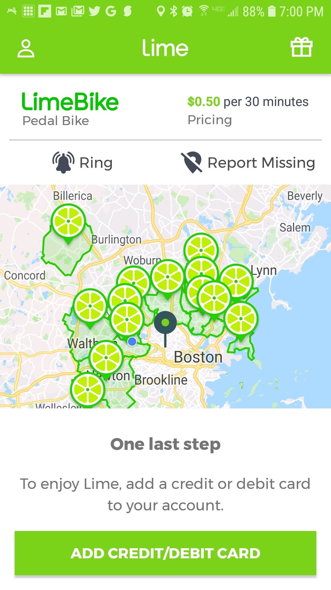 Users download an app that shows them where bikes are, then you pay around $1 for a 30 minute ride. Unlike the BlueBikes in Boston, Cambridge and Brookline, there's no docking station you have to take your bike to at the end of your ride, which means you pull over and leave the bike next to a path when you're done.