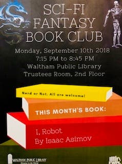 On Monday I attended my first ever sci-fi reading group at the Waltham Public Library. The featured book was Isaac Asimov's "I, Robot." The conversations, information, ideas, and hilarity that came from this book discussion was awesome! All week after that, I noticed more articles about AI, references to Asimov in the news, and saw mind blowing videos of modern robots. It is a surreal feeling when, after reading and talking about a book, you become keenly aware of its connections in your life. Often, truth truly is stranger than fiction!