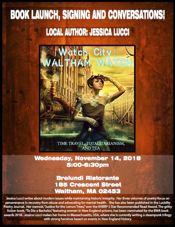 11/14 You are invited to an author signing at Brelundi's at the watch factory! I will be signing copies of my brand new Waltham-based novel, "Watch City: Waltham Watch." Come enjoy some lovingly made appetizers with me and chit-chat about Waltham's steampunk history! From 5-6:30, a perfect way to wind down mid-week!