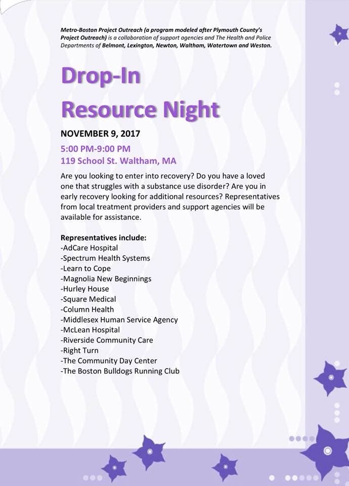 Thursday, Nov. 9, local health officials are hosting a resource Night, and are asking anyone who has had a friend or family member struggle with substance abuse come to 119 School Street to hear what substance abuse representatives from local treatment providers and support agencies can do to assist, at least 13 groups will be on hand to help, including the Boston Bulldogs Running club, which was started by a former addict.
