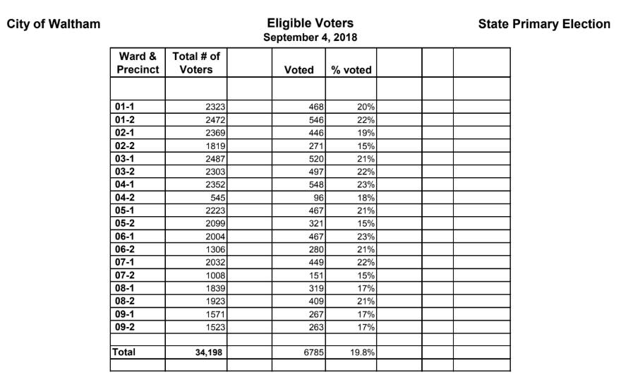 Nearly 20 percent of Waltham voters visited the polls, according to city officials.