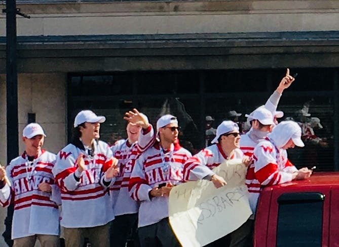 Hawk Pride was evident along the route, from signs in storefronts, to banners hung by supporters and fans. Thrill spread throughout the city as the young sports heroes shared their appreciation and excitement.