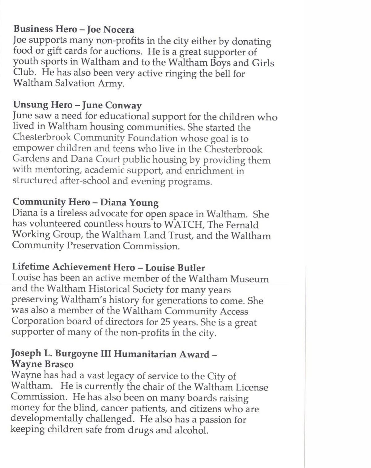 The organizations act as a panel of judges and select three to five local heroes from nominees submitted by Waltham residents and businesses in three categories - business hero, community hero and unsung hero.