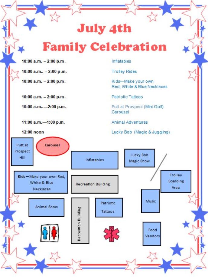 On Wednesday, July 4, 2018 from 10 a.m. - 2 p.m. at Prospect Hill Park there will be a family event featuring free children's inflatables, mini golf, Lucky Bob show, Animal Adventures, music, trolley rides, food.
