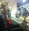 Miebach weaves together a variety of materials, including graphics of weather data and seasonal migration of marine life collected in the Gulf, and silken braided ropes, to cover a wall as well as create a series of hanging structures that swirl 10-feet high toward the ceiling.