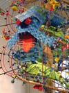 Her sculptural basket weaving techniques create large representations of buoys hanging suspended, tilting as if in water. On the walls, a blue dragon (the Labrador Current) faces off against an orange one (the Gulf Stream); silken, braided ropes coil; sticks mark off depths; green washers show chlorophyll concentrations. There’s even a buoy that symbolically tells the story of the Andrea Gail’s sinking, made famous by "The Perfect Storm."