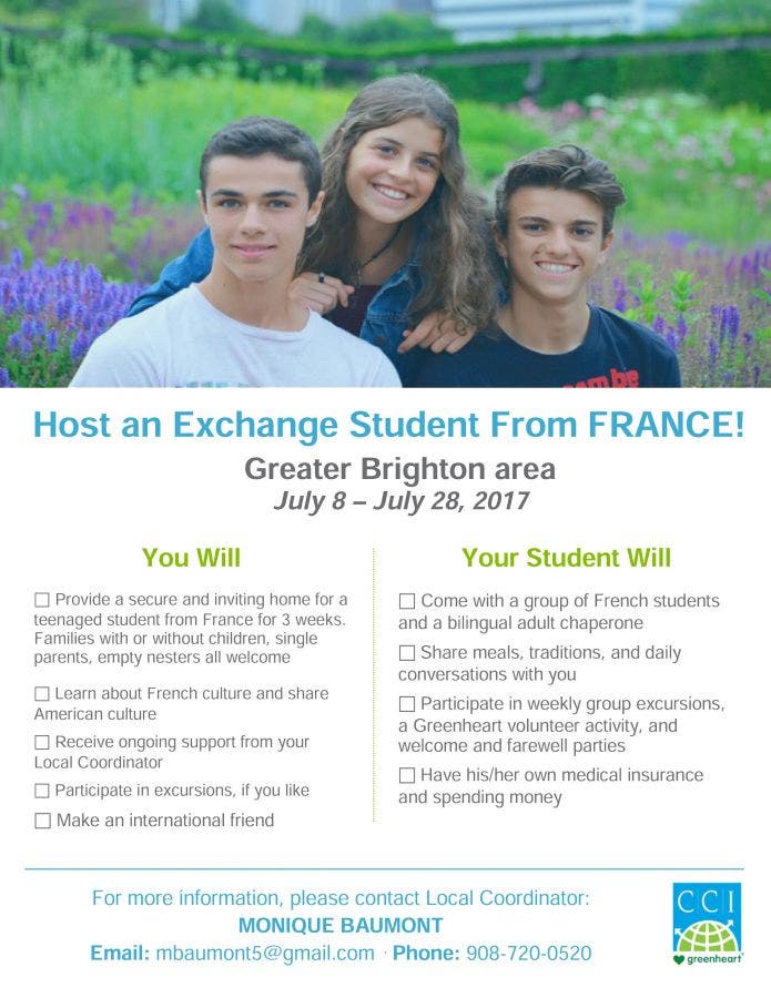 CCI Greenheart's Cultural Exchange Program is coming to Boston this summer! As part of this program, 10 high-school age exchange students and 1 adult leader from France will be flying to Boston for a 3 week cultural immersion program from July 8-July 28. The program is currently seeking 11 host families from Newton, Brookline, Brighton, Watertown, and surrounding areas to provide meals and housing for one student or the adult leader for the duration of the three-week program