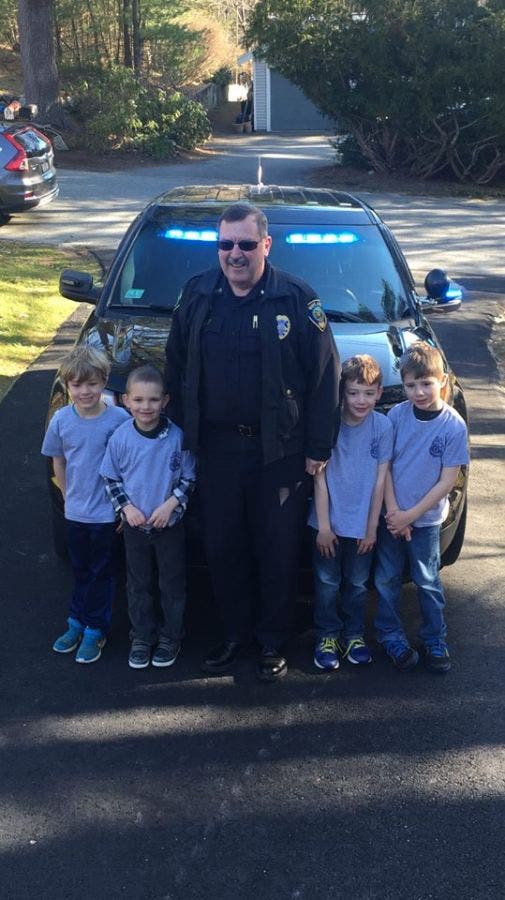WAYLAND, MA—Chief Robert Irving made good on his delivering his auction item to the winners on Monday morning, giving those winners of the popular Backpack Auction a ride to school in a squad car.