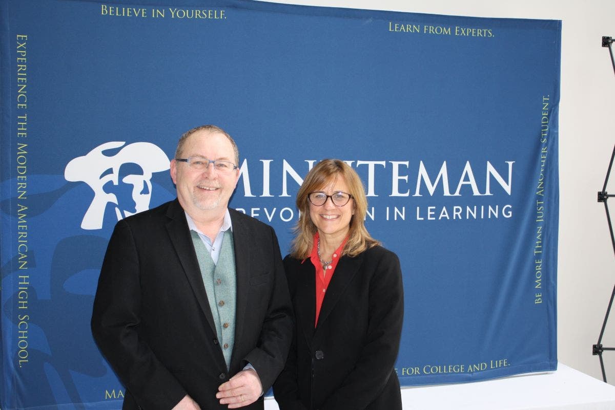 PHOTO CAPTION: Celebrating success. Minuteman Superintendent Dr. Edward Bouquillon and Career and Technical Education Director Michelle Roche celebrate the award of another major state grant to support the schoolβs new Advanced Manufacturing program.
