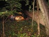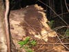 The tree, which Houghten estimated to be at least 3 feet in diameter, was completely rotted at its base and had fallen onto the woman's four-door Nissan sedan, caving in the roof about 18-20 inches -- basically down to the headrest. The driver's compartment area was on fire.