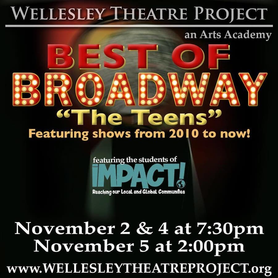 Wellesley Theatre Project’s (WTP) will present a Best of Broadway: “The Teens” on November 2nd and 4th at 7:30pm and November 5th at 2pm featuring students from the audition-only Junior and Senior, IMPACT! General admission is $15 for adults and $10 for students and seniors. VIP table seating is $20. The WTP Studio’s at the Wellesley Community Center is located at 219 Washington Street in Wellesley. Tickets can be purchased online at www.wellesleytheatreproject.org or at the studio.