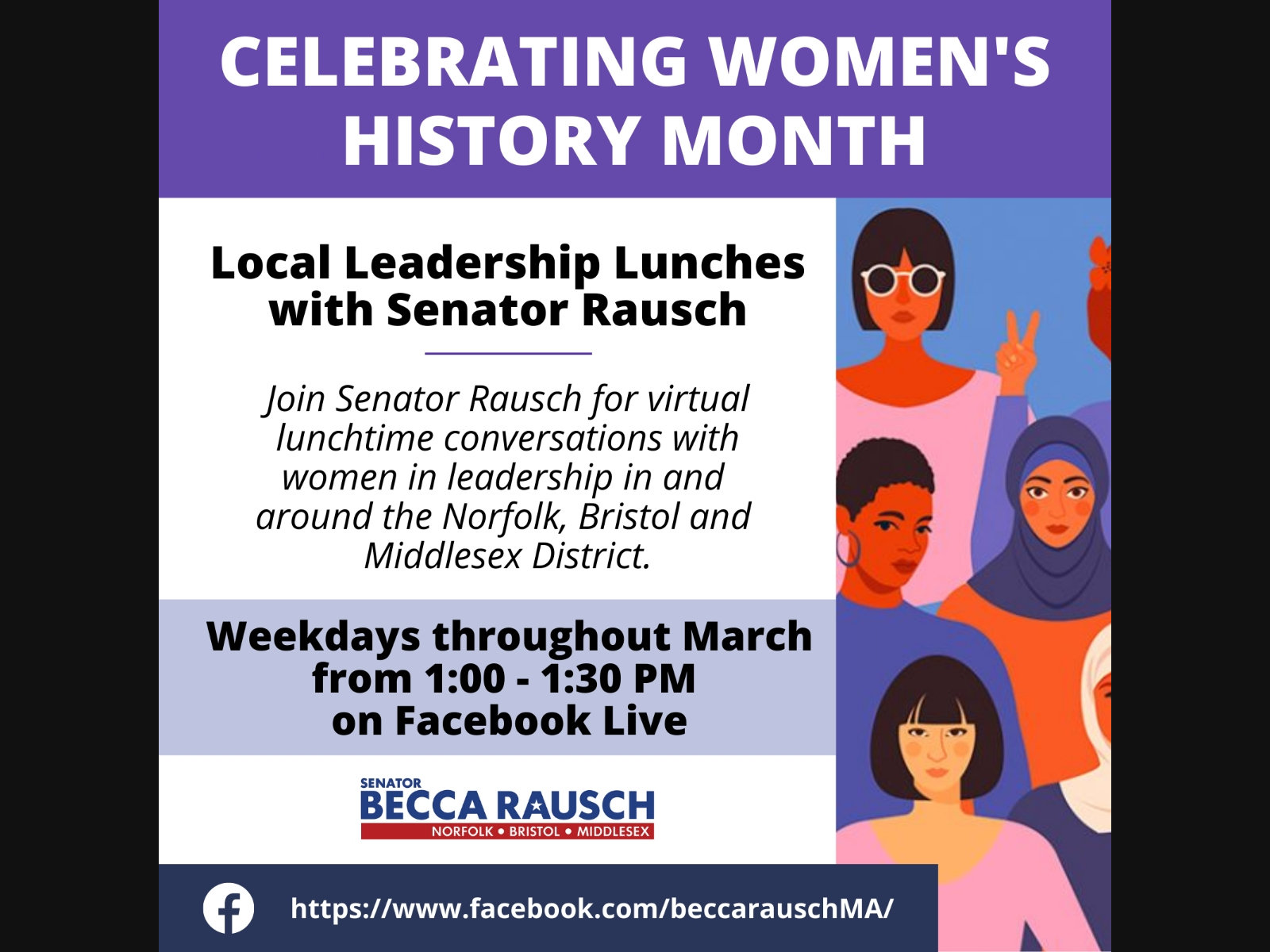In honor of Women's History Month, Senator Becca Rausch (D-Needham) has launched a series of Local Leadership Lunches, a Facebook Live series highlighting incredible role models and women in leadership in and around the Norfolk, Bristol and Middlesex District. Throughout the month of March, Senator Rausch will stream Facebook Live conversations with scientists, authors, student advocates, business leaders, and community volunteers from the district for these lunchtime virtual events.
