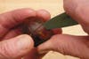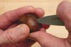 This next step is really important. Before roasting, make shallow cross cuts in both the round and flat sides of the chestnuts. The reason for doing this is that the chestnut meat inside the shell is moist, and that moisture will turn to steam quickly as the chestnuts roast. Making cuts that just penetrate the chestnut shell will allow steam to escape and prevent the chestnuts from exploding, which does indeed happen and is no holiday joy at all to clean. You bet I’m talking from experience. Make the cuts by holding the chestnut firmly between your thumb and forefinger. Then use the point of a paring knife (short bladed knife) to make two cuts into and just below the hard shell. Make one cut about ½ - ¾ inch with the grain of the chestnut shell and then another cut the same size across the grain. Make those cross cuts on both sides of the chestnut.