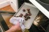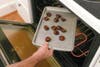After making those cuts in all the chestnuts, put them in a baking pan if you’re using a big oven, and put the baking pan with the chestnuts on it in the oven as soon as it heats to 450 degrees. If you’re using a toaster oven, put the chestnuts right on the toaster oven rack and turn on the toaster oven to bake at 450 degrees. No matter what type oven you use, set a cooking timer for 25 minutes. When the timer sounds, either take the baking pan out of the oven or open the toaster oven door and let the chestnuts cool until they’re safe enough to touch.