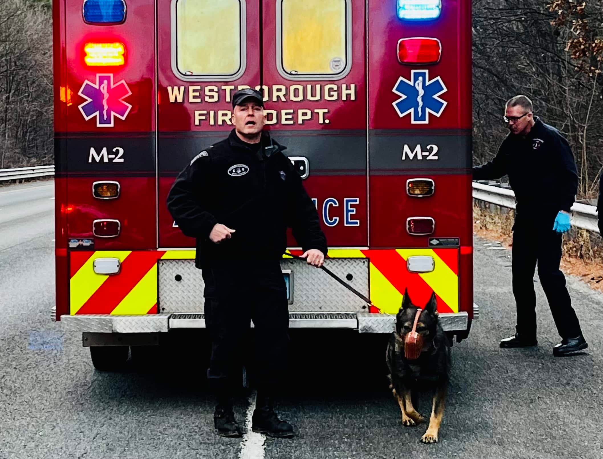 WESTBOROUGH, MA — After a state police trooper and his four-legged partner were injured in a crash Monday afternoon, both were taken by ambulance for treatment thanks to a new Massachusetts law that protects police dogs injured on duty, Westborough Fire said.