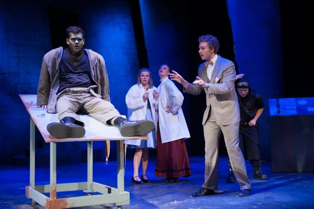 Matt Gagnon started out playing in the pit orchestra for the musicals when he was still in Junior High, and now is the lead as Dr. Frankenstein and will be majoring in Voice in college. He has been balancing the rehearsals while leaving town to perform at the National Association of Music Educators in Nashville. Caroline Lawlor, who plays the female lead, Elizabeth, will be recording her first EP of original music in Nashville in December and will be auditioning for “The Voice” in January. Ben Rigione started going to the summer program in Junior High and got involved with sound and tech “because I liked knowing how things worked” and found he “fit” in theater. For this production he is Sound Design Engineer and will be majoring in Audio at college next year.