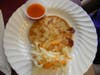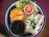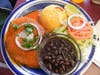 Dinner plates typically come with rice and beans, shredded lettuce and fresh lime. Smaller dishes (flautas, pupusa) come with a side of marinated cabbage salad topped with cilantro and a sprinkle of cheese.