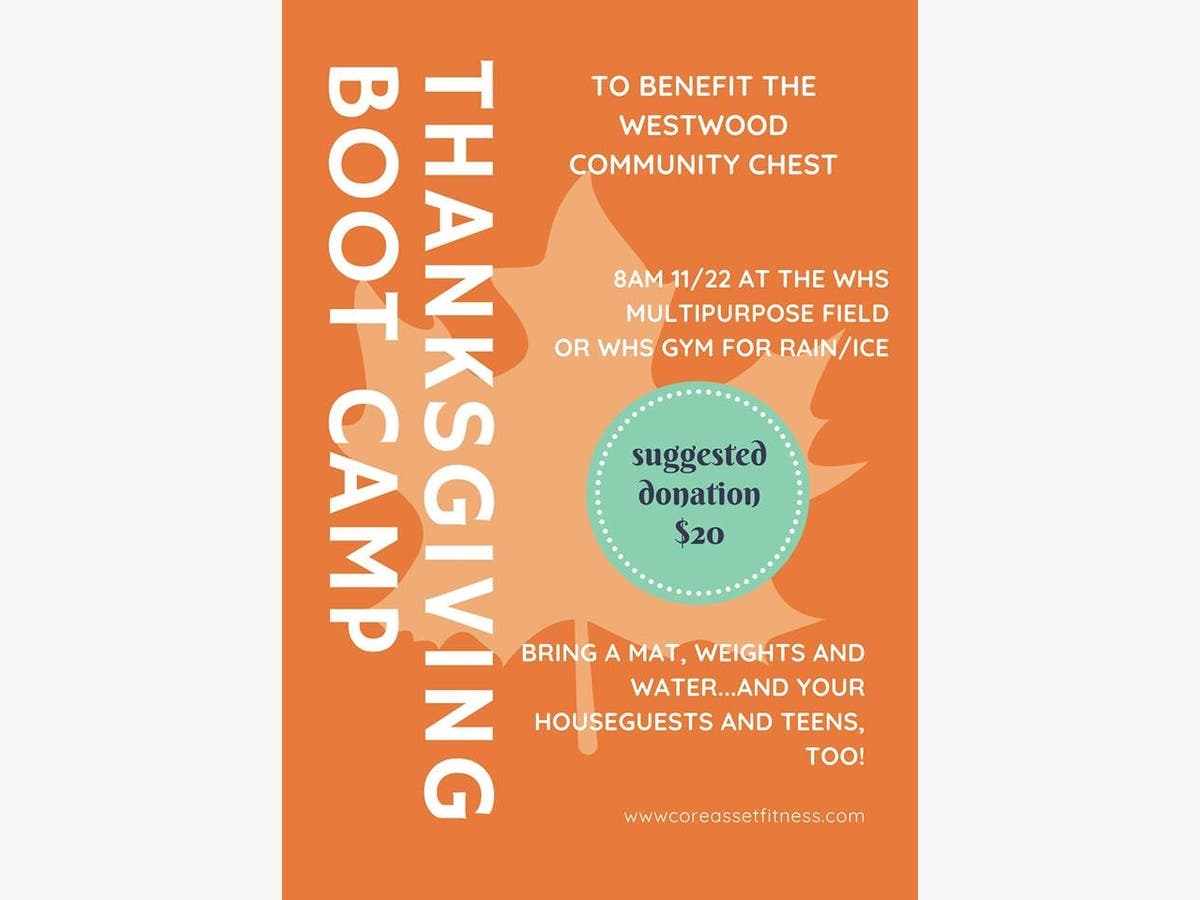 Core Asset Fitness will be hosting a Thanksgiving Boot Camp at 8am on Thanksgiving morning to benefit Westwood Community Chest (WCC)*. WCC is a nonprofit whose mission statement is “...dedicated to helping Westwood residents in need through temporary financial assistance. The organization is run by a volunteer board and works with several town organizations to ensure that our community members get the help they need. WCC receives funds from private donors, businesses and town organizations and distributes them to help families in need through a confidential application process.” It helps Westwood residents in need with things such as camp tuition and heating bills.
