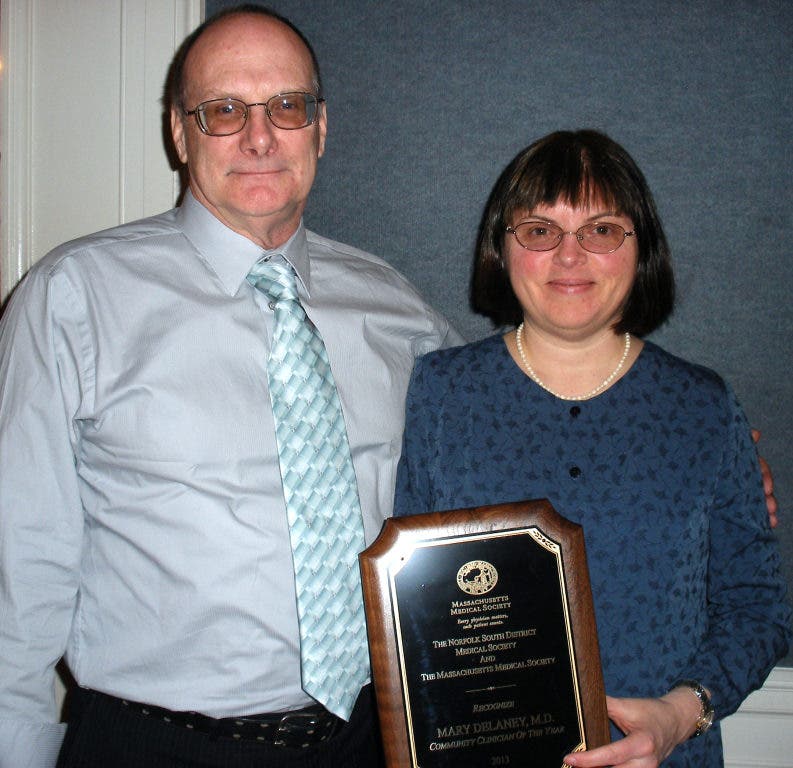 Waltham –March 15 – East Weymouth resident Mary L. Delaney, M.D. has been honored by her peers of the Norfolk South District Medical Society as the 2013 Community Clinician of the Year. She received the award at the district’s annual meeting March 14 at the Neighborhood Club of Quincy.