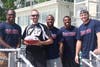 From left to right, Patriots players Matthew Slater, James White, Jordan Richards and AJ Derby present Weymouth High School with a game ball in honor of their 116,000 volunteer hours. Social Studies Lead Teacher and Student Citizenship Director Justin Galusha was on hand to accept the gift.